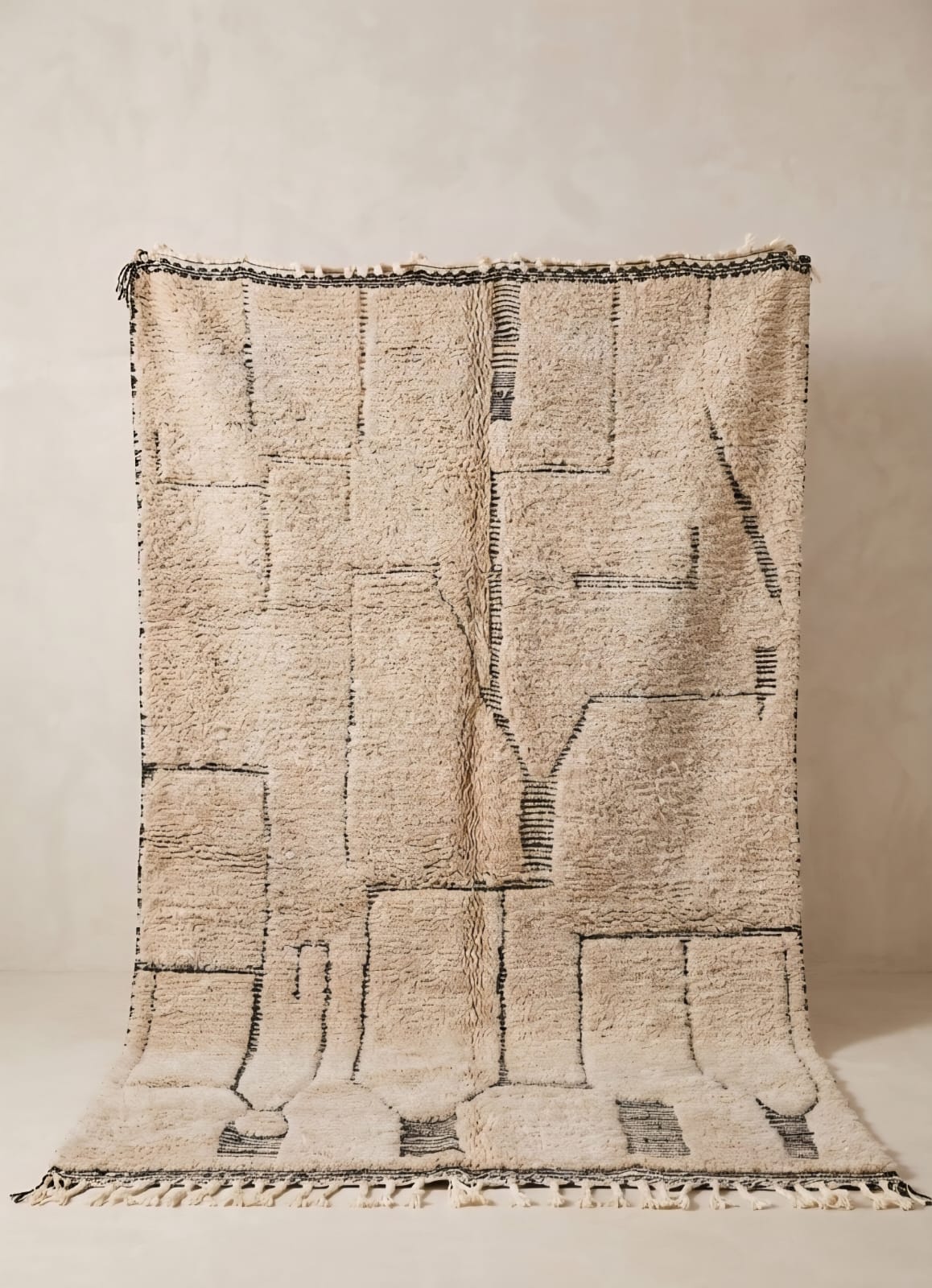 This contemporary Berber rug is handwoven from luxuriously soft natural wool, featuring a creamy ivory-beige base enhanced with subtle charcoal-black linear patterns. Its design is structured yet organic, with a patchwork-style grid and a bold abstract central motif, giving it a refined minimalist tribal character.