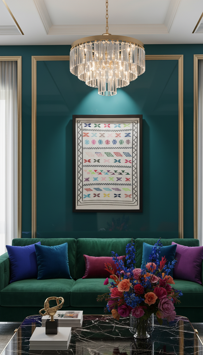 Bring a refined touch of authentic Moroccan craftsmanship into your home with this beautiful textile artwork. This piece is a handcrafted, miniature reproduction of a traditional Hanbal rug , elegantly mounted on a substantial black wooden tableau. Known for their rhythmic geometric patterns and lively color palettes, Hanbal textiles are cultural treasures that bring warmth, history, and vibrant authenticity to any interior. The artwork showcases a striking array of traditional 'X' and lozenge (diamond) motifs, central to Berber symbology, arranged in dynamic horizontal bands against a luminous off-white background. Moving beyond neutral tones, this piece is a celebration of color, featuring a dazzling spectrum of threads ranging from vivid turquoise and emerald green to lively pops of hot pink, passionate red, and sunny yellow. This bold blend creates a vibrant and contemporary aesthetic. The hand-stitched execution gives the piece a delicate, tactile texture, with borders defined by a running charcoal zigzag pattern