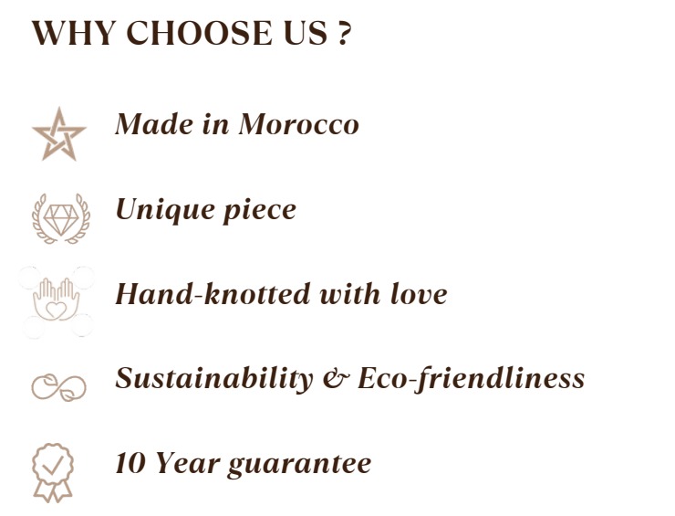 Dear customers, in case of availability of the rugs in our showroom, the delivery will take place in 15 days maximum, from Morocco to UAE,GCC,Europe, and Worldwide in the opposite case, the delivery will take place in 3 to 4 weeks maximum, since the Berber rugs are handcrafted by our creative and talented artisans, using 100% natural products which takes time during the fabrication process.