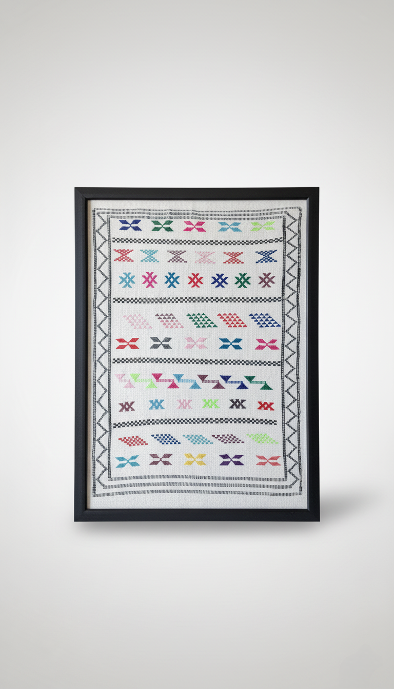 Bring a refined touch of authentic Moroccan craftsmanship into your home with this beautiful textile artwork. This piece is a handcrafted, miniature reproduction of a traditional Hanbal rug , elegantly mounted on a substantial black wooden tableau. Known for their rhythmic geometric patterns and lively color palettes, Hanbal textiles are cultural treasures that bring warmth, history, and vibrant authenticity to any interior. The artwork showcases a striking array of traditional 'X' and lozenge (diamond) motifs, central to Berber symbology, arranged in dynamic horizontal bands against a luminous off-white background. Moving beyond neutral tones, this piece is a celebration of color, featuring a dazzling spectrum of threads ranging from vivid turquoise and emerald green to lively pops of hot pink, passionate red, and sunny yellow. This bold blend creates a vibrant and contemporary aesthetic. The hand-stitched execution gives the piece a delicate, tactile texture, with borders defined by a running charcoal zigzag pattern