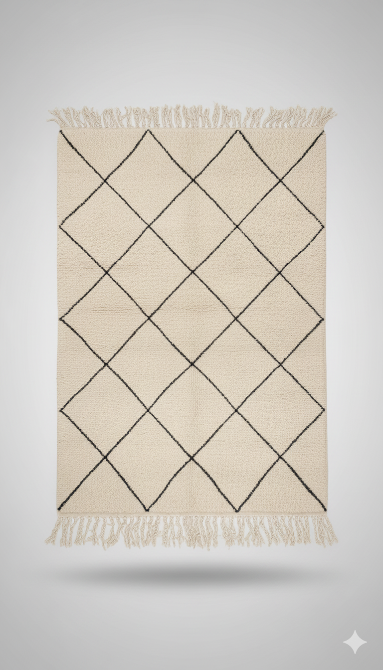 Béni Ouarain is a timeless handwoven Berber rug crafted from luxurious, natural wool in a warm ivory tone, elevated by a classic black diamond lattice that symbolizes harmony and balance in Amazigh artistry. Its dense, plush texture offers exceptional softness underfoot, while its minimalist geometric design makes it an effortlessly elegant piece for modern, Scandinavian, and neutral interiors. A perfect choice for those seeking purity, comfort, and authentic craftsmanship in a refined, contemporary home.
