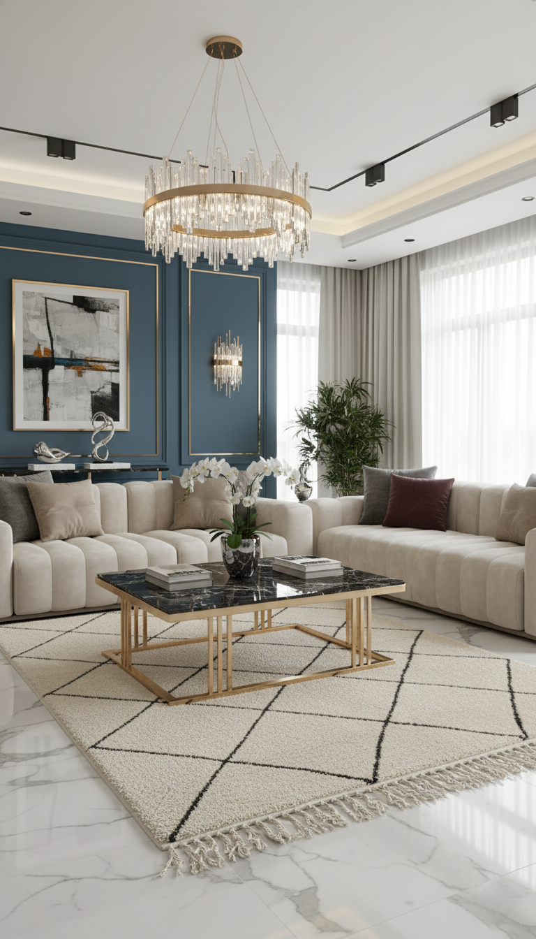 Beautiful under a beige or cream sofa, creating a warm, serene atmosphere.