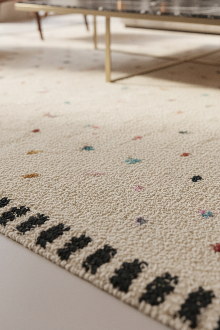 This contemporary Berber rug is crafted from soft, natural wool in a warm beige base, adorned with delicate multicolored speckles that bring a playful yet refined artistic touch. Its texture is plush, dense, and beautifully handwoven, creating an inviting feel underfoot while maintaining a minimalist sophistication. The subtle pops of color give the piece a modern, uplifting character—perfect for adding warmth, personality, and quiet elegance to any space.
